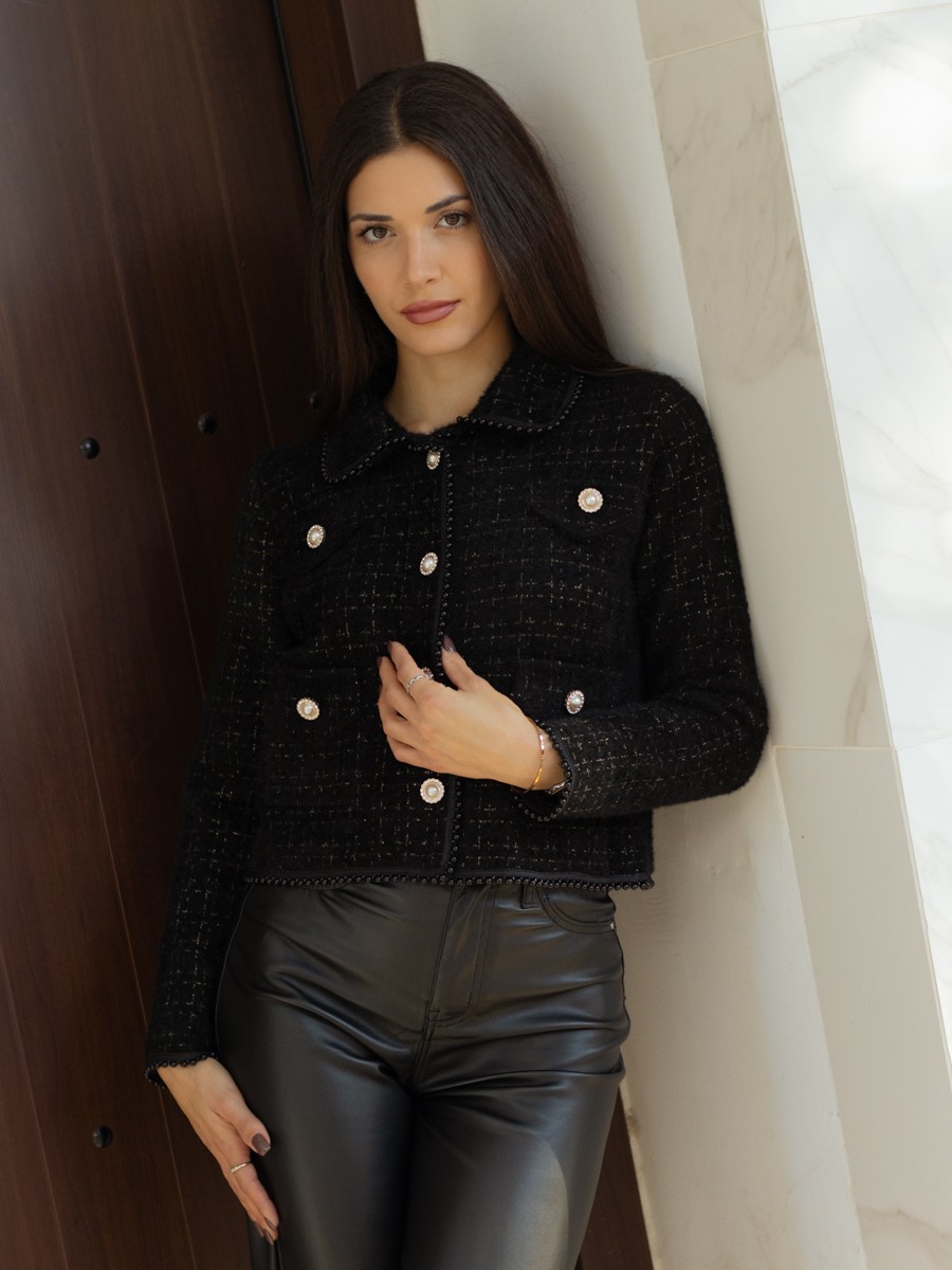 Σακάκι πλεκτό καρώ με γιακά τύπου channel, εξωτερικές τσέπες και διακοσμημένο με πέρλες. Κλείσιμο μπροστά από χρυσά στρας κουμπιά