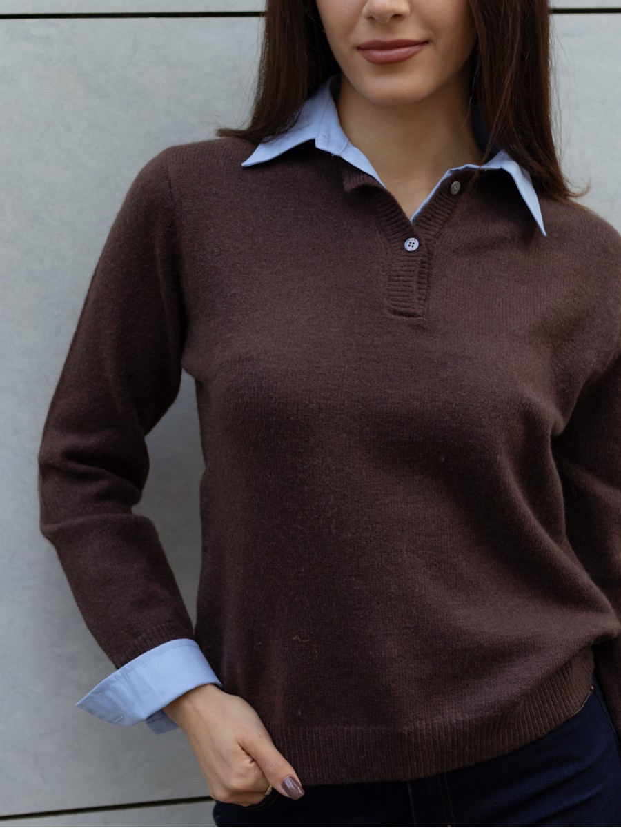 Πουλόβερ, μακρύ μανίκι, υφασμάτινες λεπτομέρειες στον γιακά και τις μανσέτες, κλείσιμο στο γιακά με κουμπιά, απαλή υφή