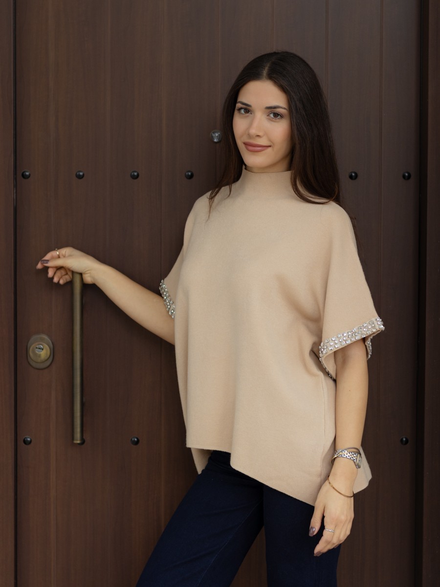 Πλεκτό με όρθιο λαιμό, χονδρή πλέξη, κοντό μανίκι με στρας διακοσμημένο, άνετη γραμμή