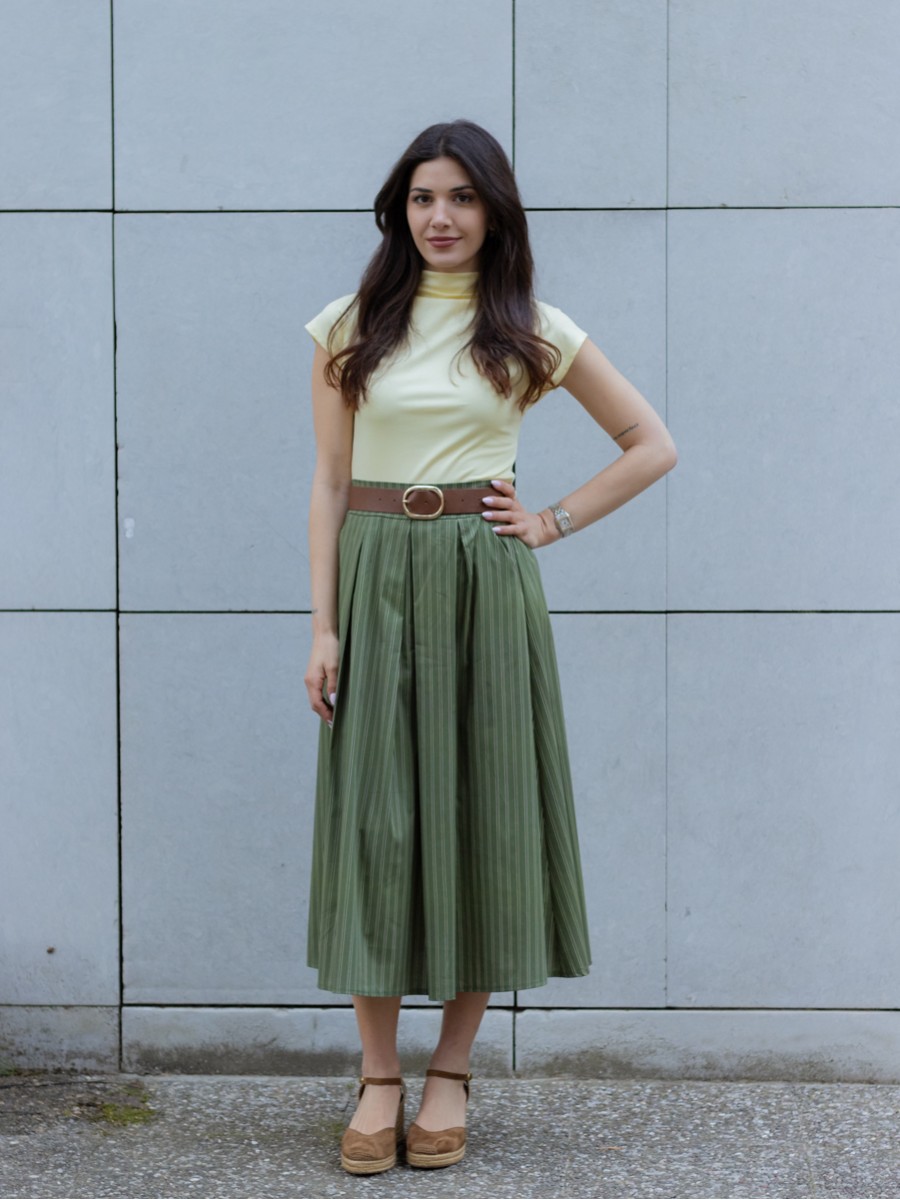 Φούστα μακρυά, βαμβακερή, με ζωνάκι μπροστά και λάστιχο πίσω στη μέση, κουφόπιετες μπροστά και τσέπες στα πλάγια